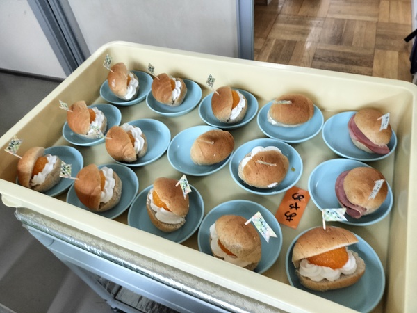 | 9月25日のおやつは、【セレクトおやつ】でした。 『ハムきゅうりサンド』『フルーツサンド』どちらかすきな方をあらかじめ選んでおける、とってもとっても楽しみなおやつの日でした。 子ども・職員のそれぞれの名前が入った旗つきサンド。子どもも大人もうれしくって、いつも以上に楽しいおやつタイムとなりました♪ 5歳児年長クラスからは、『かんぱ〜い!』の声が聞こえてきましたよ😊 |