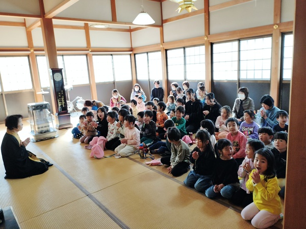 | お寺の保育園の崇徳保育園。 親鸞様の命日にあたるこの日に、おじいちゃん・おばあちゃんサポーターDayとし、数名のおばあちゃんとおうちの方と3・4・5歳児が一緒に一乗寺でお参りをしました。 みんなにしあわせを届けるために、親鸞様は昔々いろんな所・様々な人にお話をしに回られました。 【ごおん】という絵本を読んだあと、みんなに【💗しあわせ💗】って何か聞いてみました。 すると子どもたち、『おうちでみんなとご飯食べる時』『ママにギュッとしてもらう時』『パパ大好き』こんなことを教えてくれました。3歳児の子の中には、当日おばあちゃんの膝の上に座っているだけで、ニッコニコの笑顔になっている子も・・・ 【💗しあわせ💗】って、特別なことではない、日常にたくさんあることなんだなぁ・・・と、子ども達から気づかされた大人の私たちでした。 |